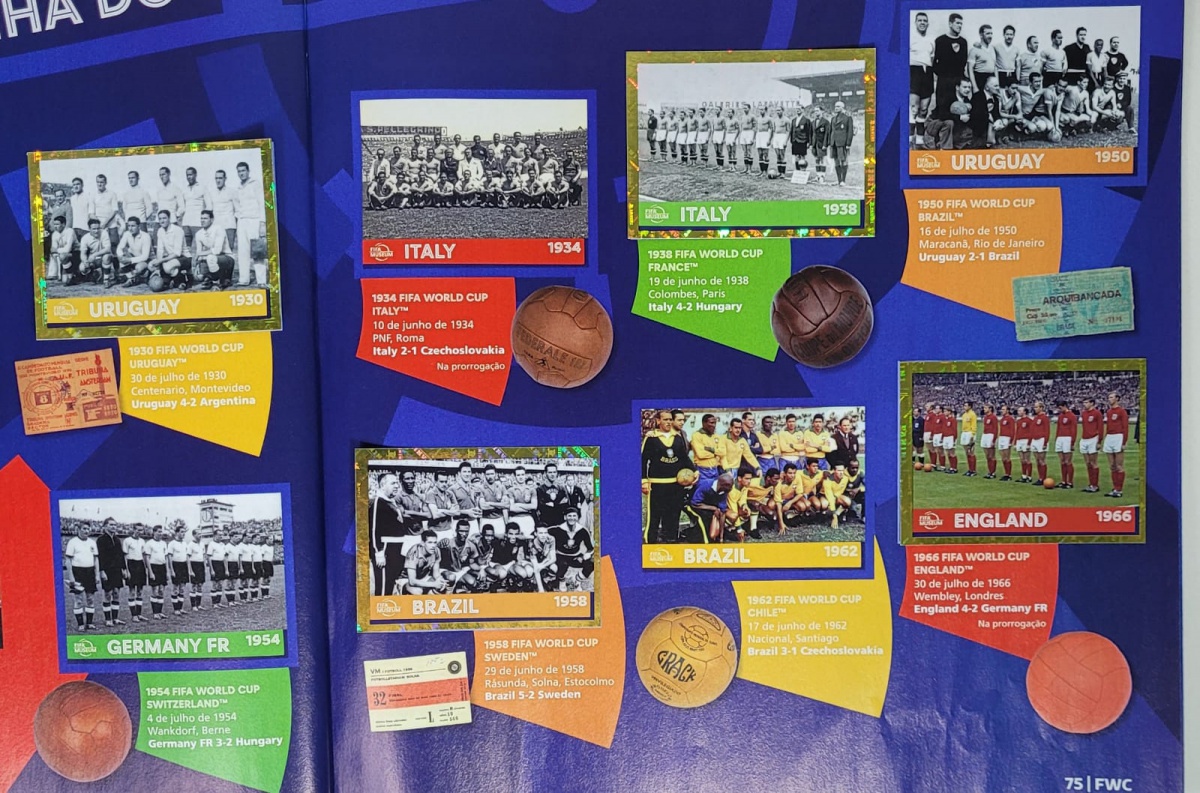 Promoção - Figurinhas Extras FWC19 a FW22 - Copa do Qatar 2022 - Museu da FIFA 1 - Uruguai 1920/Italia 1938/Brasil 1958 e Inglaterra 1966 - 4 Figurinhas - Original Panini