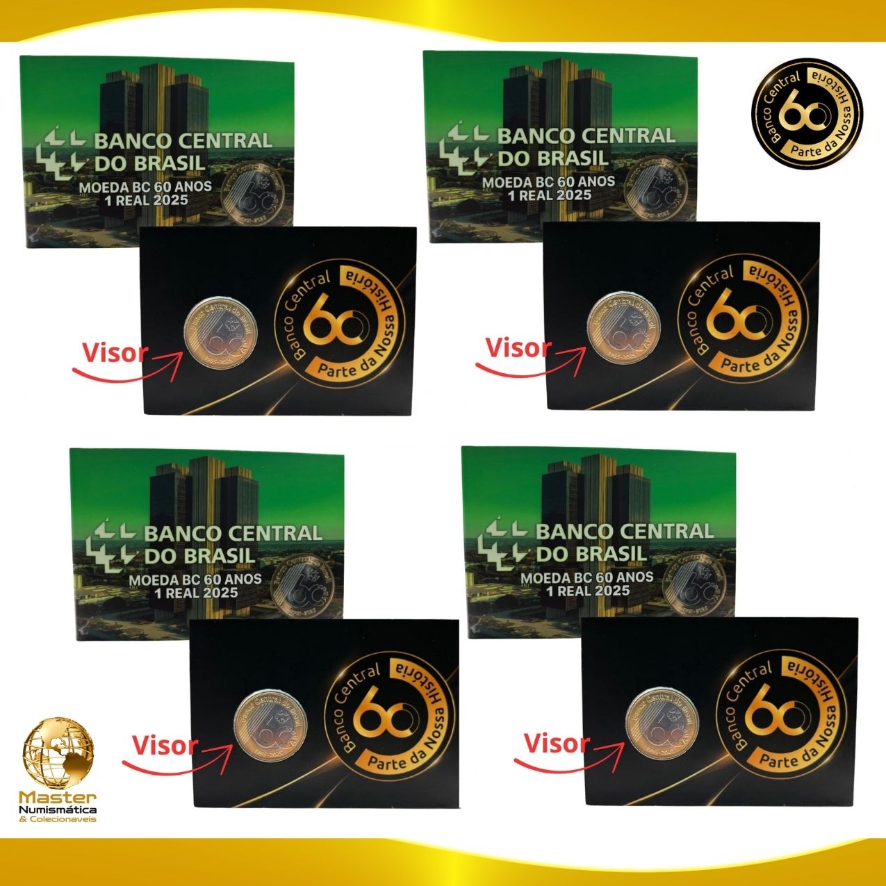 Lançamento - 04 Cartelas com visor contendo a Moeda de 1 Real 2025 - 60 Anos do Banco Central - Flor de Cunho