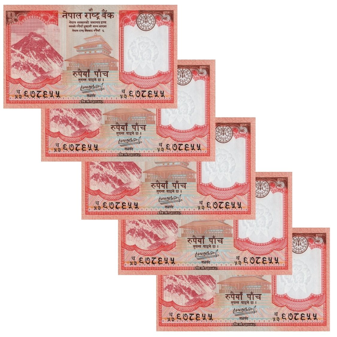 Nepal - 5 Cédulas de 5 Rupees 2020 - P-76b - Sequência - Flor de Estampa