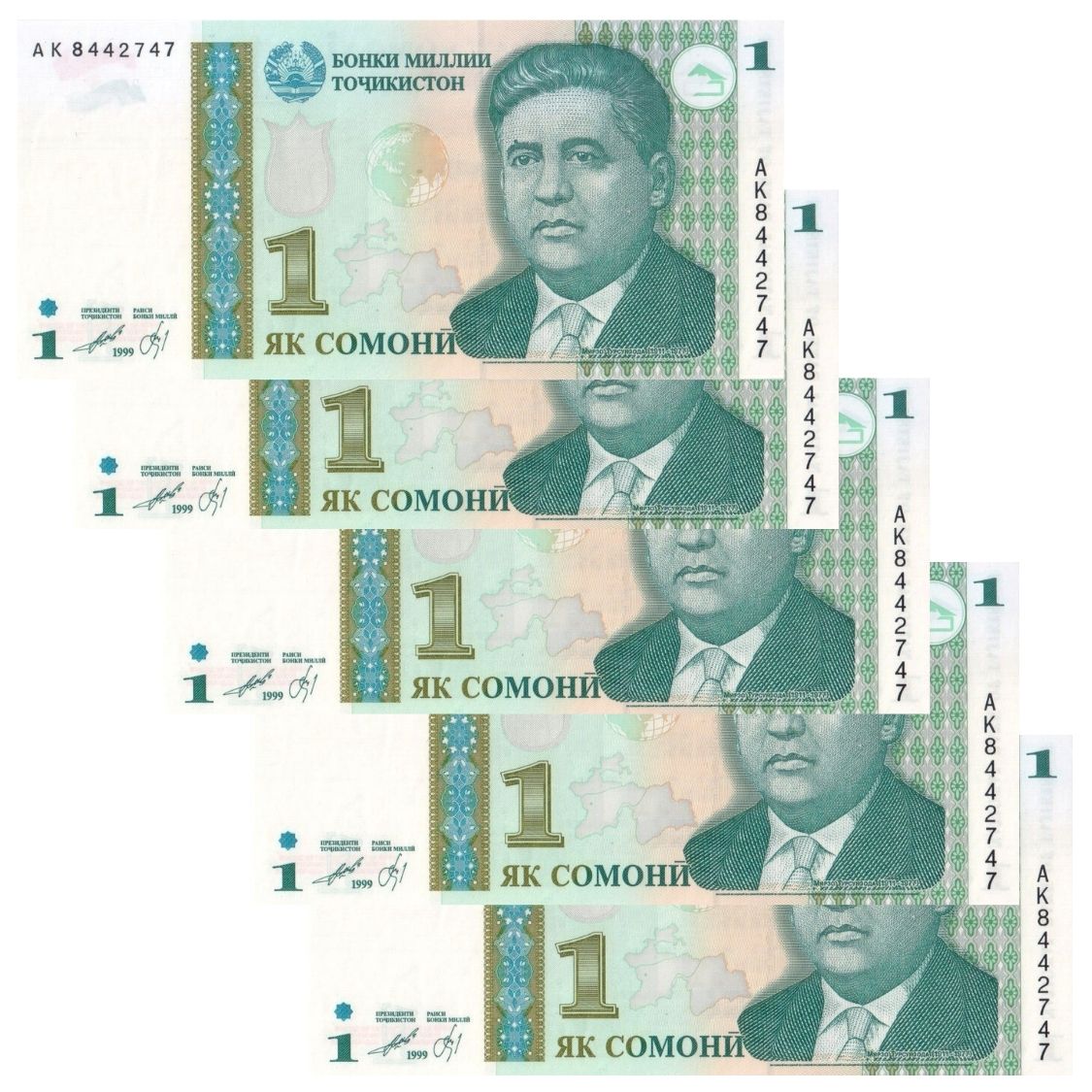 Tadjiquistão - 5 Cédulas de 1 Somoni 1999 - P-14b - Sequência - Flor de Estampa