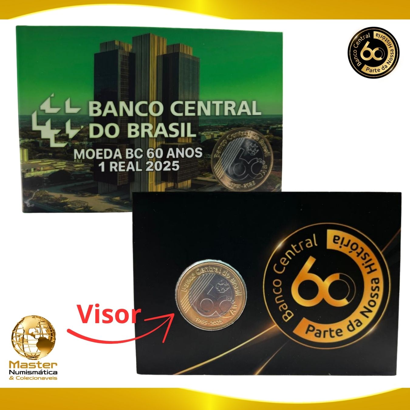 Lançamento - Cartela com Visor contendo a Moeda de 1 Real 2025 - 60 Anos do Banco Central - Flor de Cunho