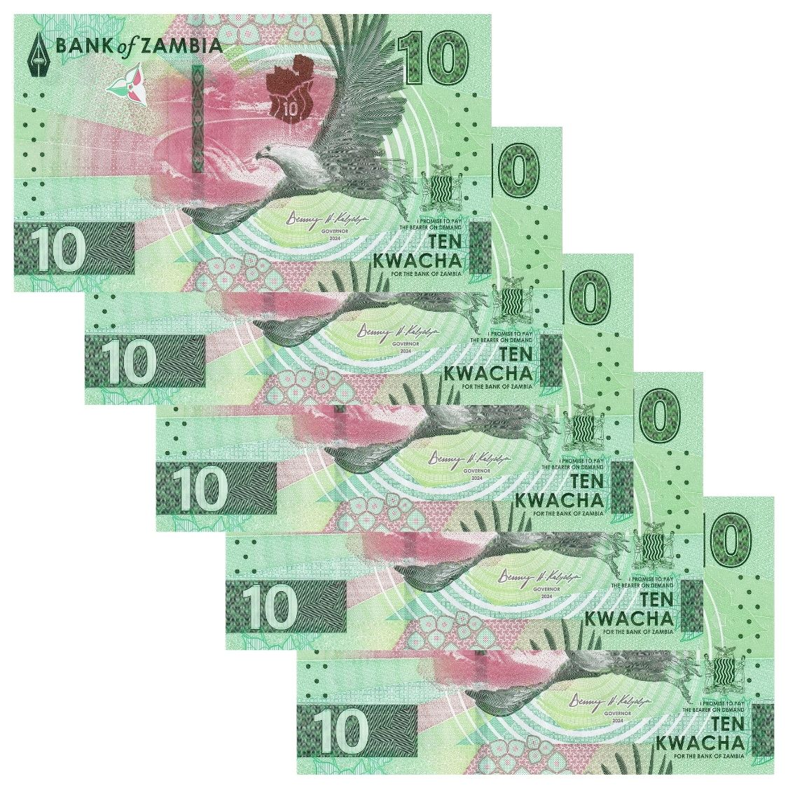 Zambia - 5 Cédulas de 10 Kwacha 2024 - P-62a - Hibrida - Sequência - FE