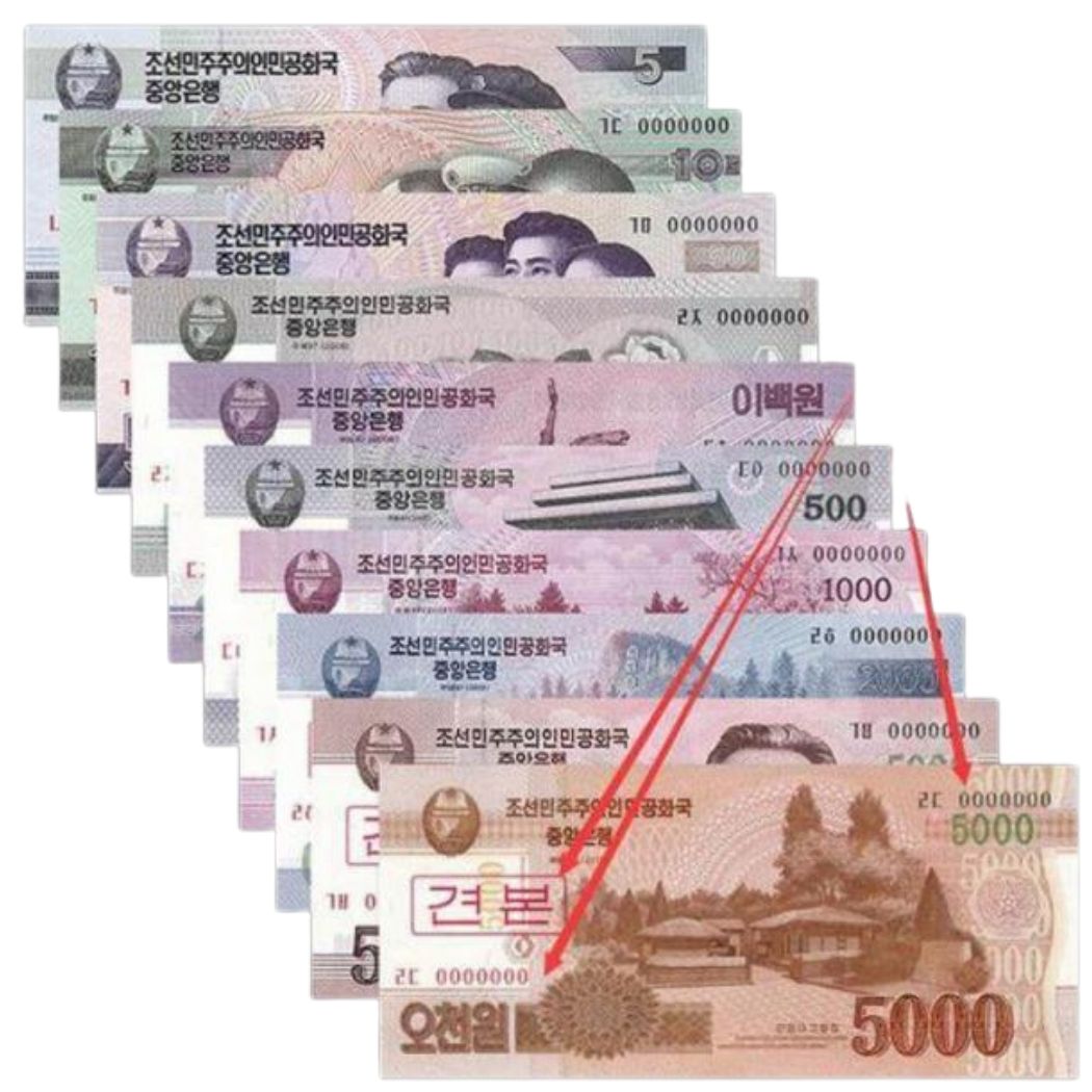 Coréia do Norte - Spécimen - Série com 10 Cédulas de 5 a 5000 Won 2002/2008 - FE