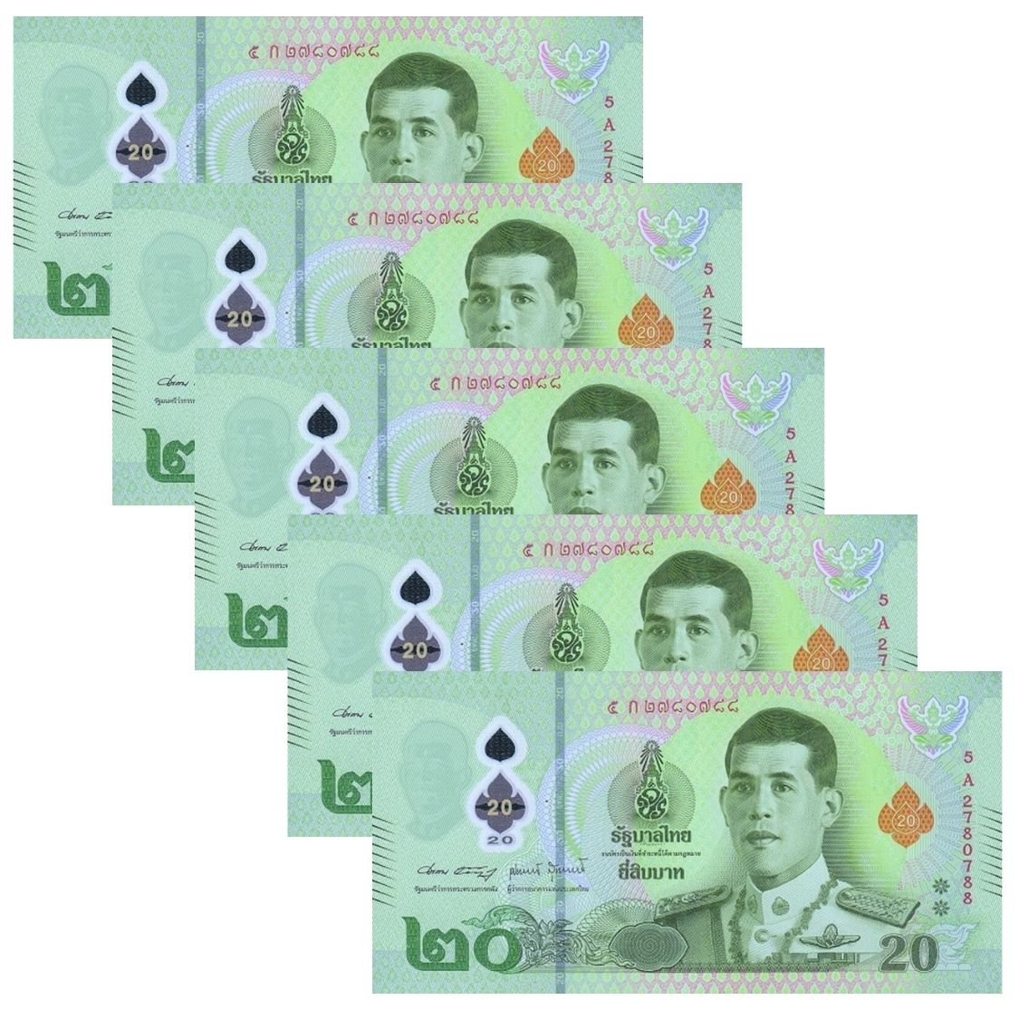 Tailândia - 5 Cédulas de 20 Baht 2022 - P-141Aa - Polìmero - FE