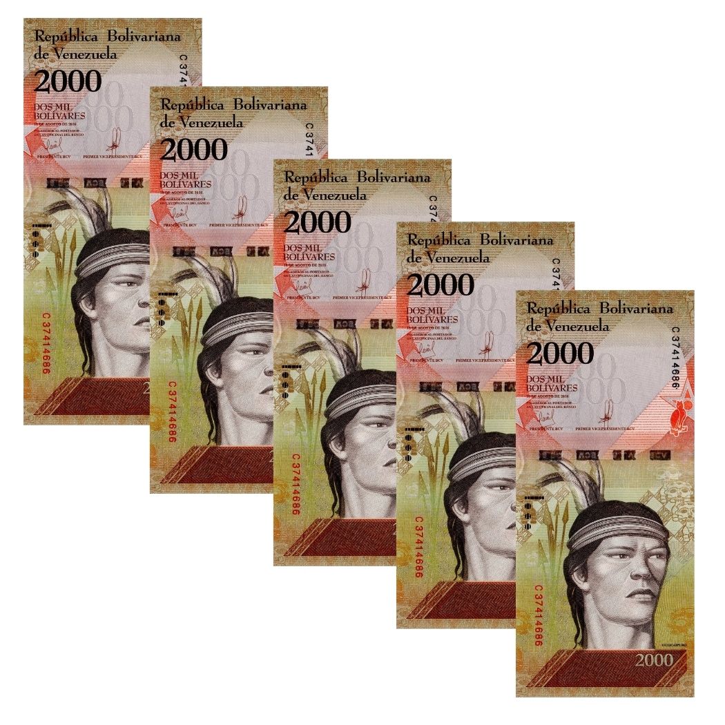 Venezuela - 5 Cédulas de 2000 Bolivares Forte 2016 - P-96b - Guaicaipuro - Sequência - FE
