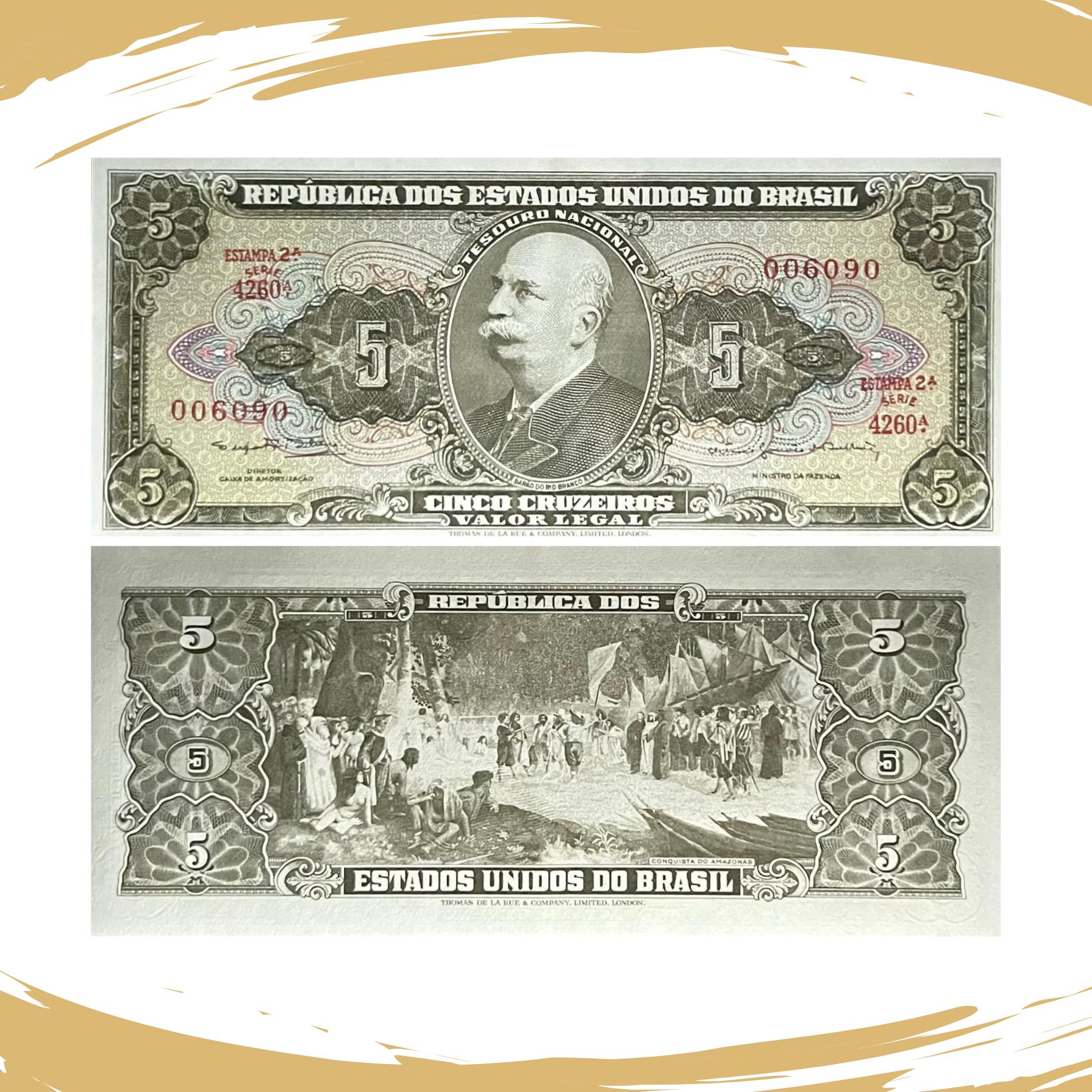 Cédula do Brasil - 5 Cruzeiros 1964 C-074b - 2ª Estampa - Série 4260 - Sob/Fe - Sérgio Ribeiro/Otávio Bulhões - Cédula nunca circulada, contem pequenas manchas do tempo