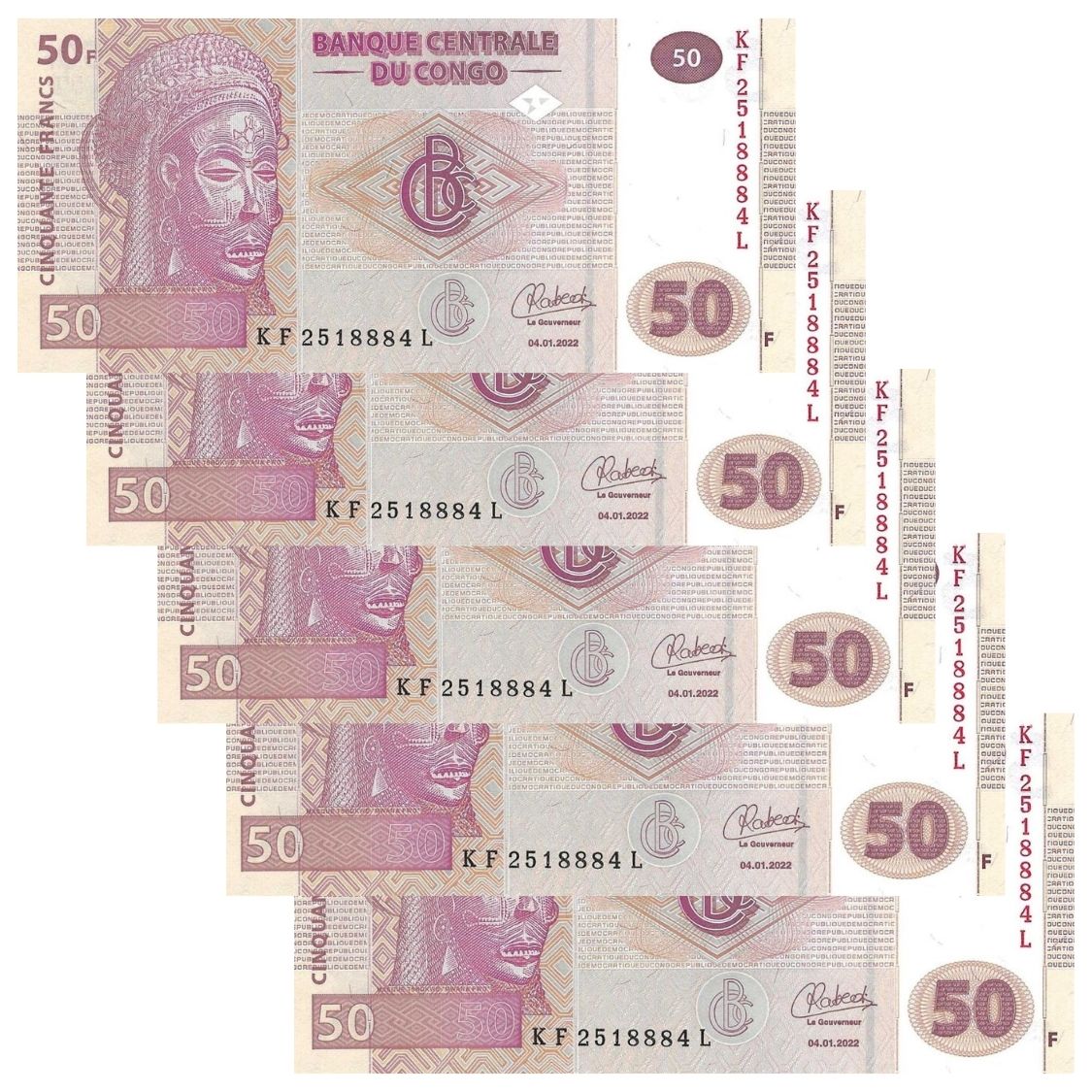 Congo - 5 Cédulas de 50 Francs 2022 - P-97Ab - Sequência - FE