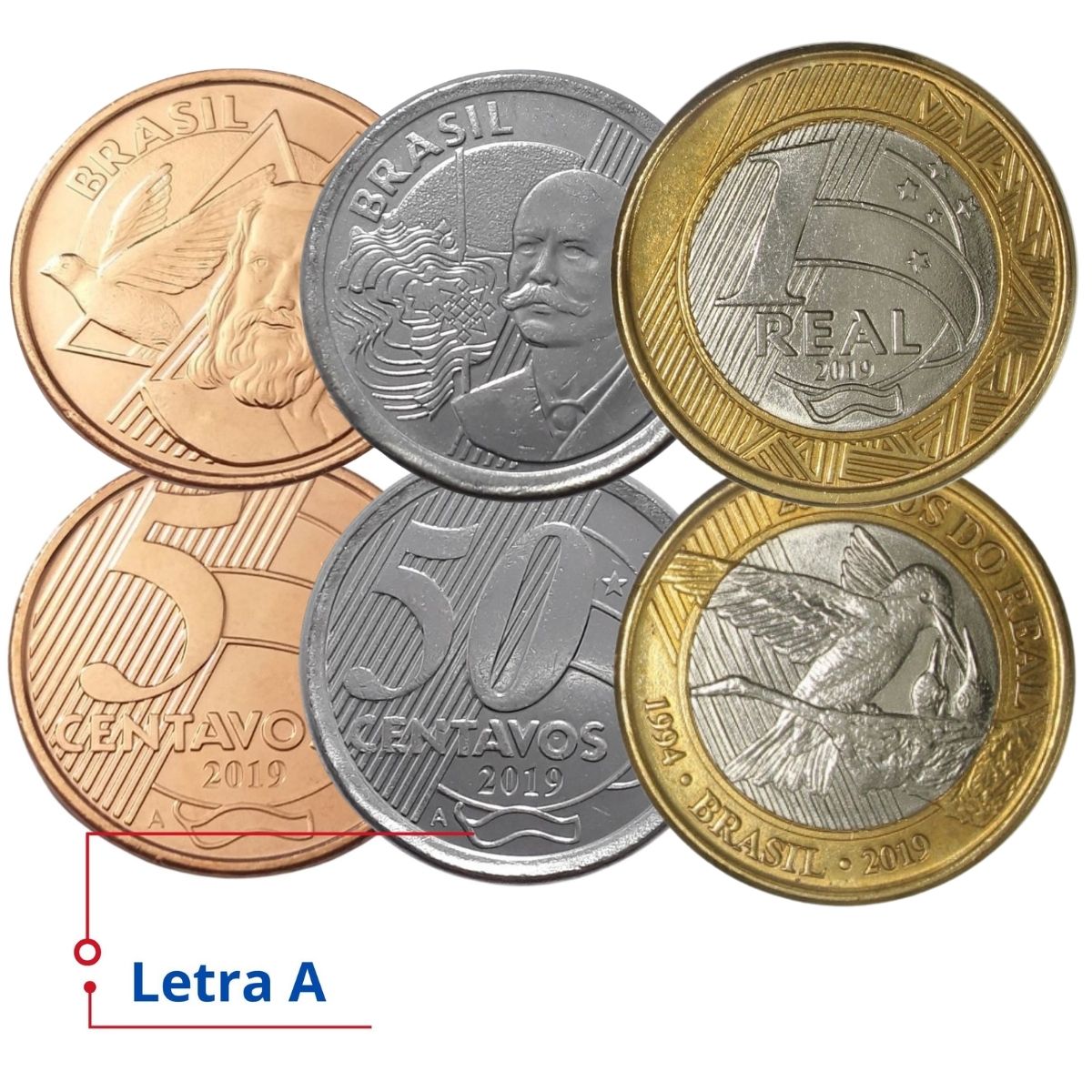 Trio de Moeda 2019 - Beija Flor + Letra A - 1 Real 2019 25 anos do Real (Beija Flor) + 5 e 50 Centavos 2019 A (Holanda) - V-485a/564a/624 - Flor de Cunho