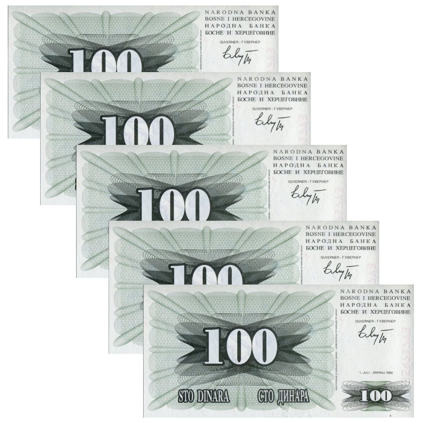 Bósnia Herzegovina - 5 Cédulas de 100 Dinara 1992 - P-13a - FE