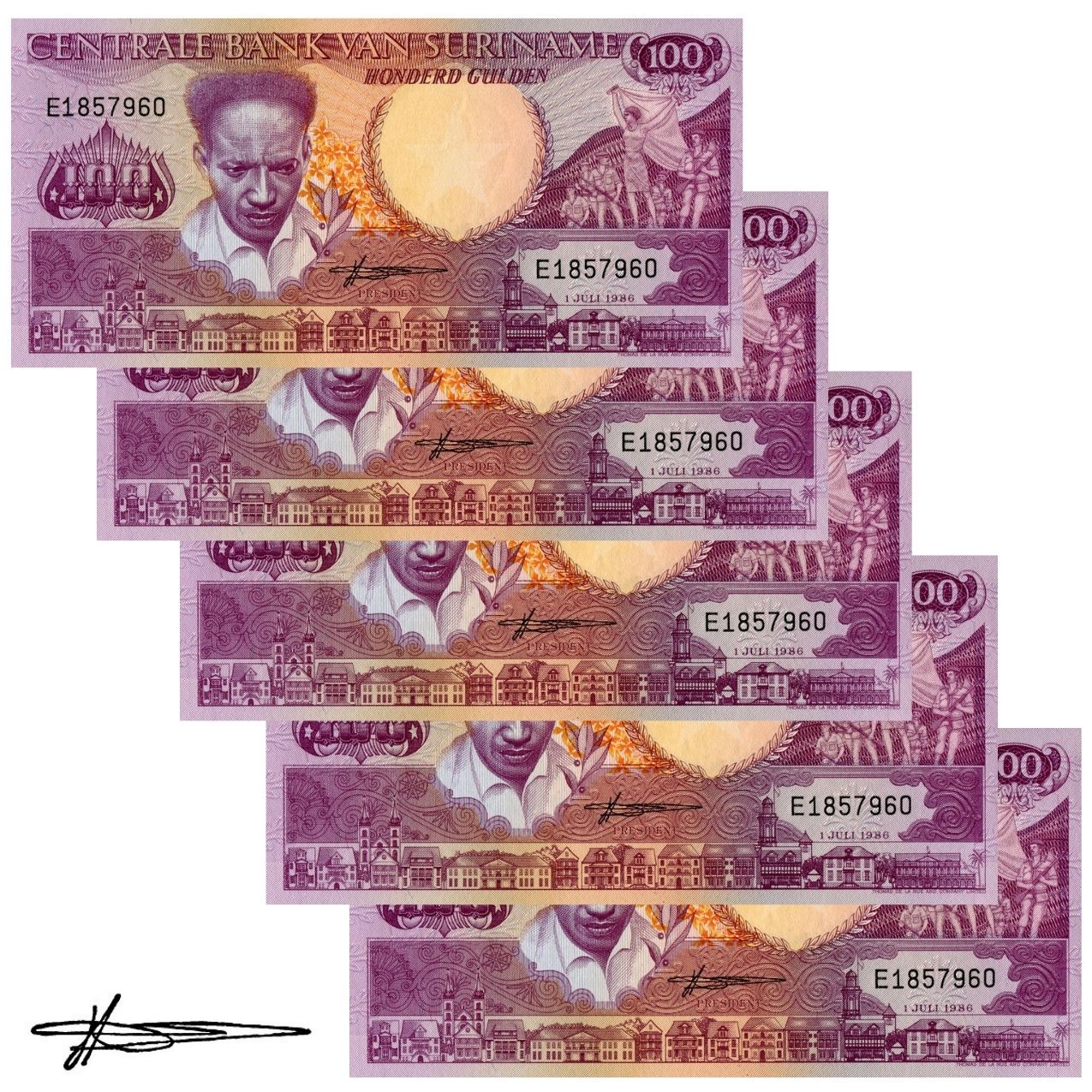 Suriname - 5 Cédulas de 100 Gulden 1986 - P-133a - Sequência - Flor de Estampa