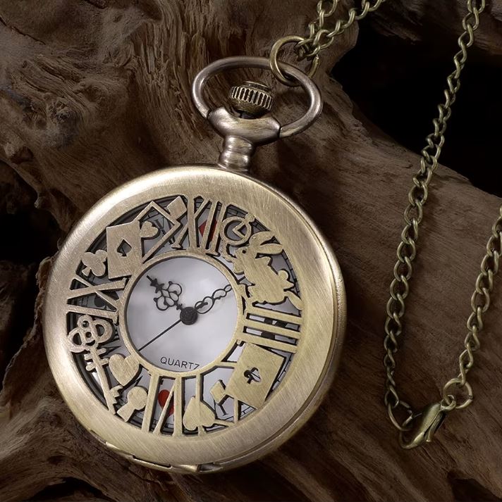 Relógio de Bolso Vintage Alice - Serve como Colar e Pingente - Design único e diferenciado. Este relógio de bolso é funcional e pode ser usado como um colar ou pingente, tornando-o um acessório versátil para qualquer roupa, também pode ser usado como decoração. Obs: Para abrir apertar o pino, para ajustas as horas puxar o pino. Corrente 80cm - Cor predominate Bronze