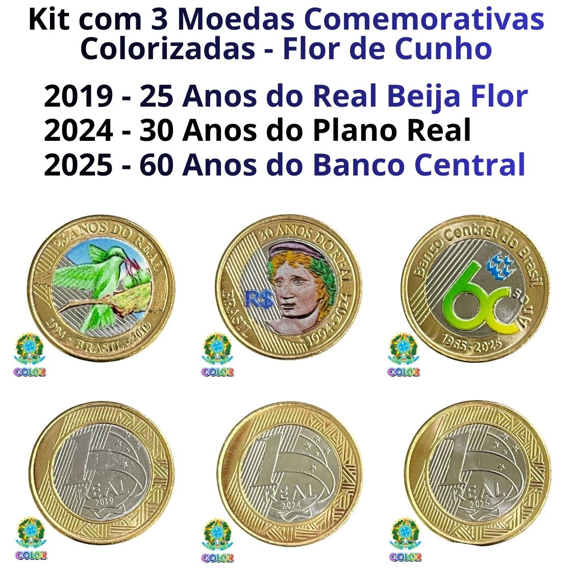 Coloridas - Kit com 3 Moedas Comemorativas Coloridas - 2019 25 anos do Real Beija Flor, 2024 30 anos do Real e 2025 60 anos do Banco Central - Flor de Cunho Colorizadas - Total de 03 moedas. Edição Limitada