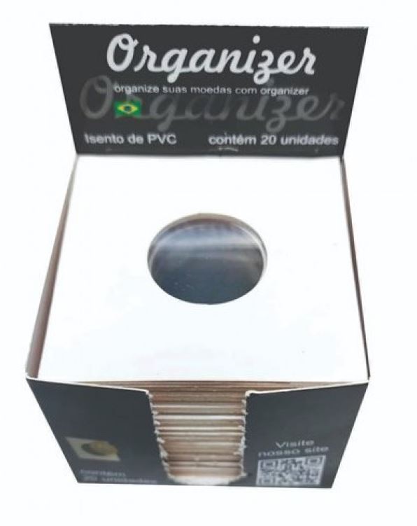 Coin Holder Reutilizavel 25.0 mm - CX com 20 Und - Organizer - Primeiro Coin Holder que não precisa grampear e não utiliza cola. Podendo abrir para ajustar ou trocar a moeda. Produzido com plástico Isento de PVC, caixa contém 20 unidades, embalagem prática que facilita a utilização no dia a dia. Ideal para moedas de 1Real da 1º Familia e 25 Centavos da 2ª Familia.