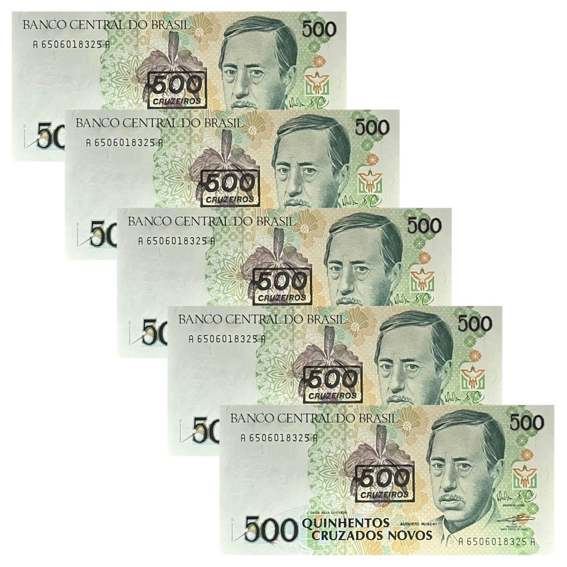 Brasil - 5 Cédulas de 500 Cruzeiros 1990 C-213 - Augusto Ruschi - Sequência - FE - Carimbo sobre 500 Cruzados Novos - Mailson da Nóbrega/Wadico Bucci.