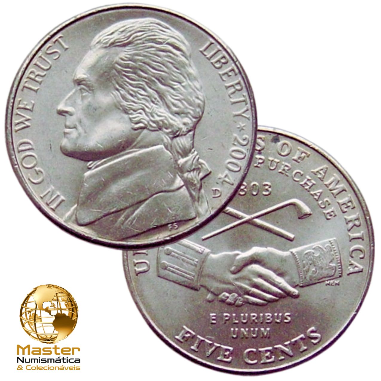 Estados Unidos - Moeda de Five Cents 2004 P - Bicentenário da expedição de Lewis e Clark - Lousiana Purchase - KM# 360 - Jefferson Nickel - Flor de Cunho