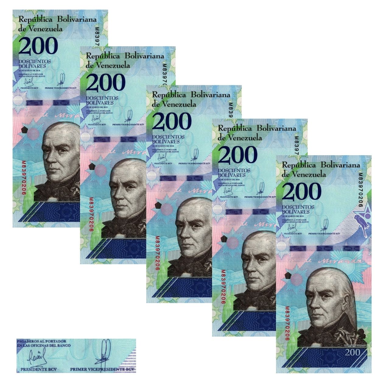 Venezuela - 5 Cédulas de 200 Bolivares Soberanos 2018 - P-107b - Francisco de Miranda - Sequência - FE
