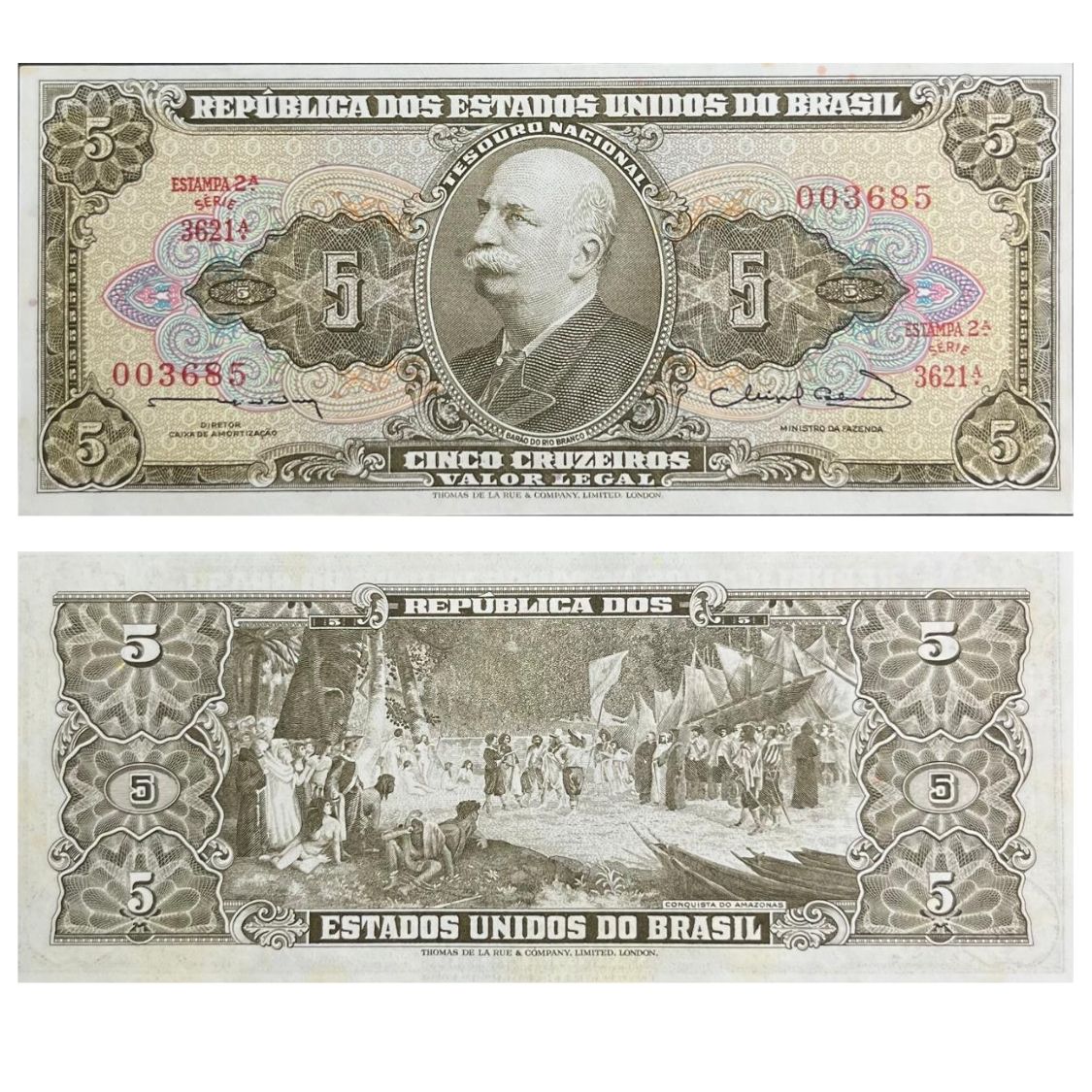 Brasil - Cédula de 5 Cruzeiros 1963 C-072 - 2ª Estampa - Série 3621 - Sob/Fe - Reginaldo Nunes/Miguel Calmon - Cédula nunca circulada, contem pequenas manchas do tempo.