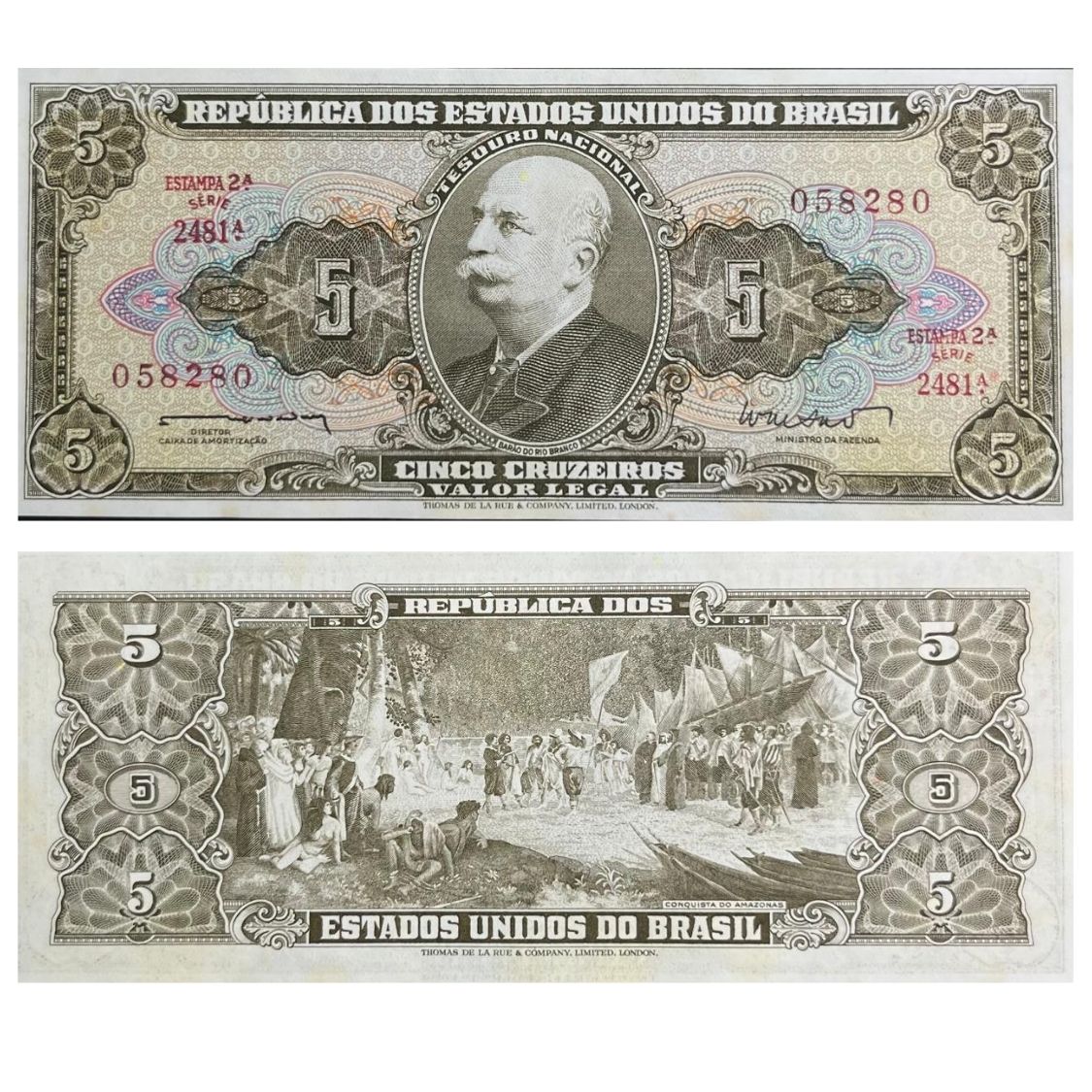 Brasil - Cédula de 5 Cruzeiros 1962 C-071 - 2ª Estampa - Série 2481 - Sob/Fe - Reginaldo Nunes/Walter Salles - Cédula nunca circulada, contem pequenas manchas do tempo.