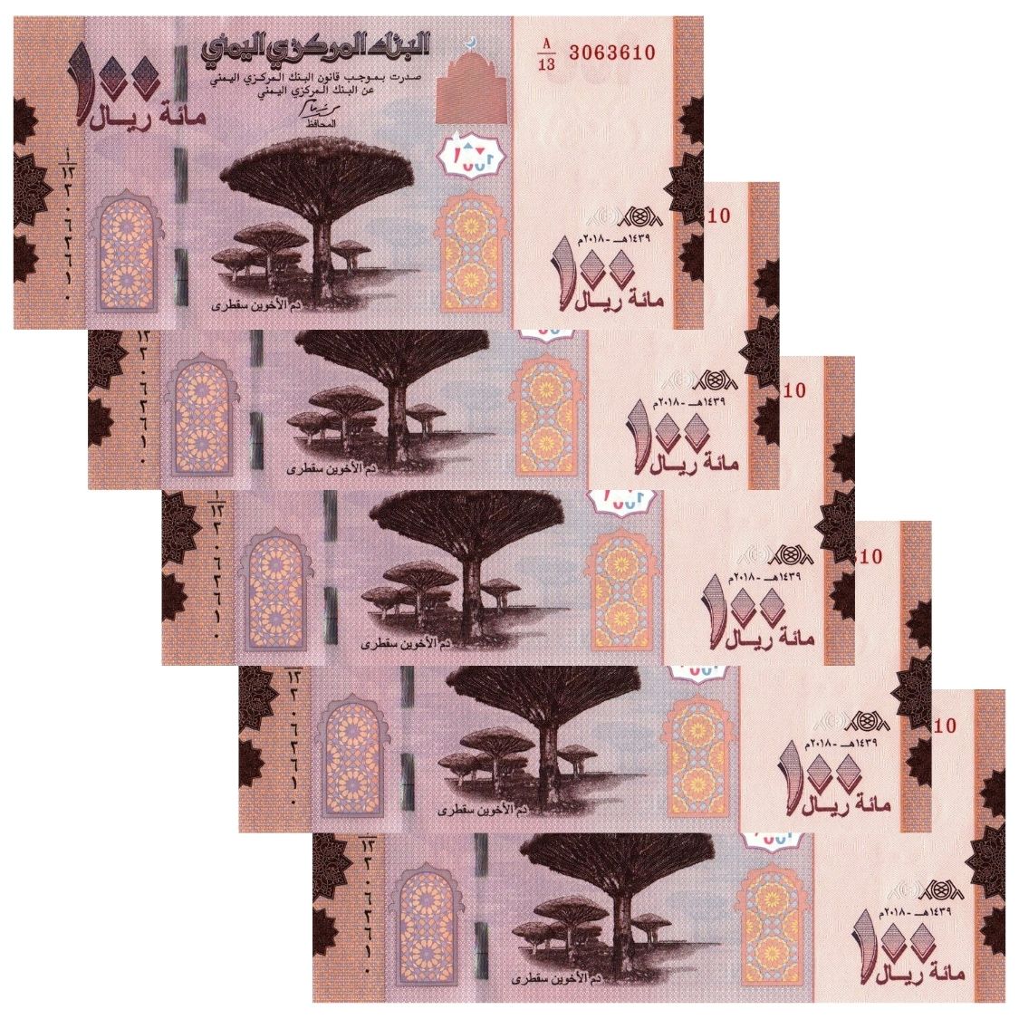 Iemen - 5 Cédulas de 100 Ryals 2018 - P-37a - Sequência - Flor de Estampa